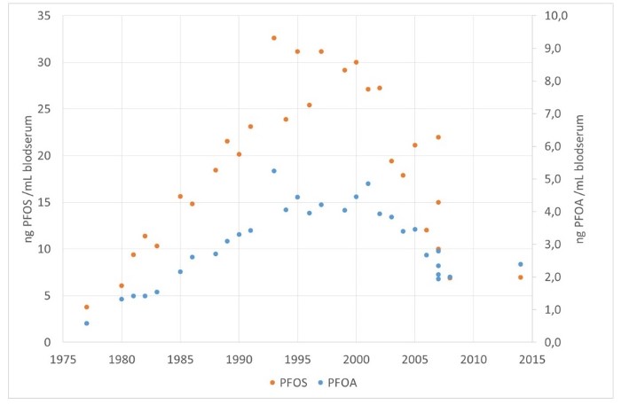 Konsentrasjonene av PFOA, PFNA, PFHxS og PFOS økte fra 1970-tallet fram til omtrent år 2000. Etter dette har konsentrasjonene av PFOS og PFOA gått ned, mens konsentrasjonene av PFHxS og PFNA har vært stabile eller noe økende. De observerte trendene ser ut til å fortsette (FHI, 2023).