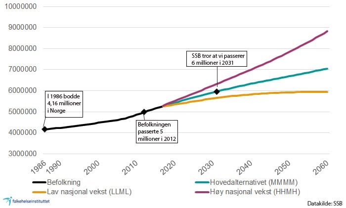 - Et framskrivingsalternativ med lavt barnetall, lav innvandring og lav levealder innebærer at folketallet vil synke fra 2035 og ligge på 5,2 millioner i 2060.