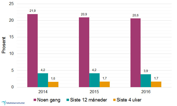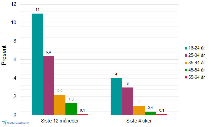 - om lag 5 prosent som oppgav å ha brukt cannabis i løpet av dei siste 12 månadene
