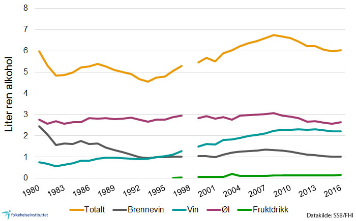 Det registrerte forbruket gjekk ned frå 1980 til 1993, deretter auka det kraftig fram til 2008, og har deretter gått ned. Sjå figur 2 som viser forbruket av alkohol per innbyggjar på 15 år og over frå 1990 til 2020. I 2020 var den registrerte alkoholomsetninga 7,23 liter rein alkohol per innbyggar 15 år og eldre. Dette er ein auke på 19,5 prosent frå 2019. Det er grunn til å anta at auken i registrert omsetning i 2020 kan skyldast bortfall av taxfree og grensehandel grunna pandemien (FHI, 2022).