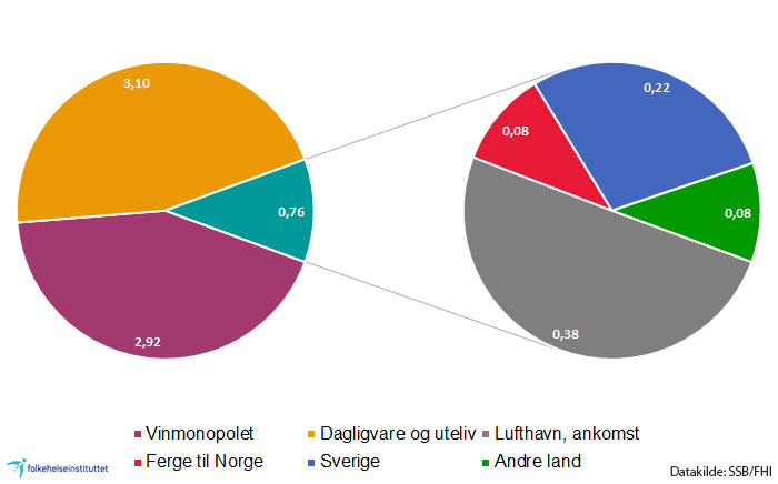 Taxfree- og grensehandel utgjer størstedelen av den uregistrerte omsetninga, og må leggast til den registrerte omsetninga for å gi eit riktigare bilete av det totale alkoholkonsumet i Noreg. På grunn av pandemien er tala for taxfree ved ankomst til norske lufthamner i 2020 meir uvisse enn tidlegare, og er anslått til 0,07 liter rein alkohol per innbyggar 15 år og eldre. Dette er ein reduksjon frå 0,35 liter rein alkohol i 2019. Data for handel i Sverige er i 2020 berekna til 0,15 liter rein alkohol per innbyggar 15 år og eldre av Centralförbundet för alkohol- och narkotikaupplysning (CAN), en reduksjon frå 0,6 liter rein alkohol i 2019. Anna uregistrert omsetning er ikkje mogleg å estimera for 2020. Basert på disse anslaga forbrukar kvar innbyggjar i aldersgruppa 15 år og over i gjennomsnitt 7,45 liter rein alkohol i året.