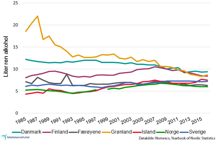 - Vi drikk i gjennomsnitt over 7 liter rein alkohol per år, rekna per innbyggjar over 15 år.