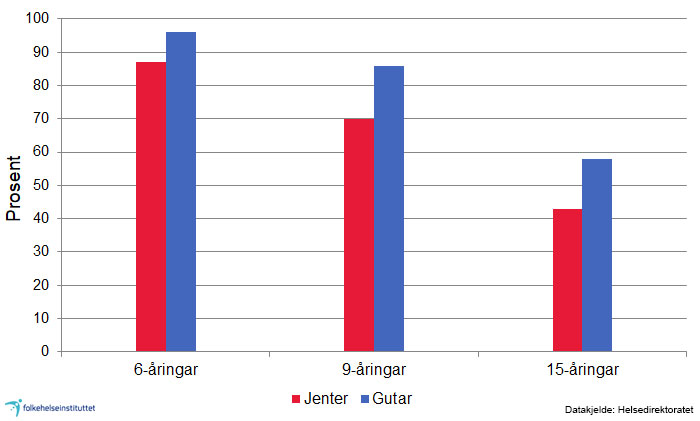 Fysisk aktivitet har blitt målt med aktivitetsmålere i tre tilfeldige utvalg av norske barn og unge (Steene-Johannessen et al., 2019) (figur 3). Blant 6-åringene tilfredsstiller 87 % av jentene og 94 % av guttene anbefalingen for fysisk aktivitet. Blant 9-åringene tilfredsstiller 64 % av jentene og 81 % av guttene anbefalingen, mens tilsvarende tall blant 15-årige jenter og gutter er henholdsvis 40 % og 51 %. I alle aldersgrupper er det signifikant flere gutter enn jenter som tilfredsstiller anbefalingen for fysisk aktivitet.