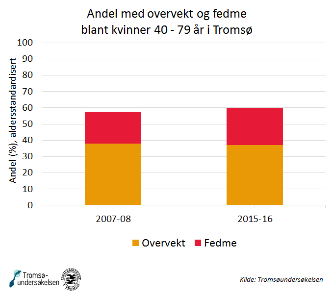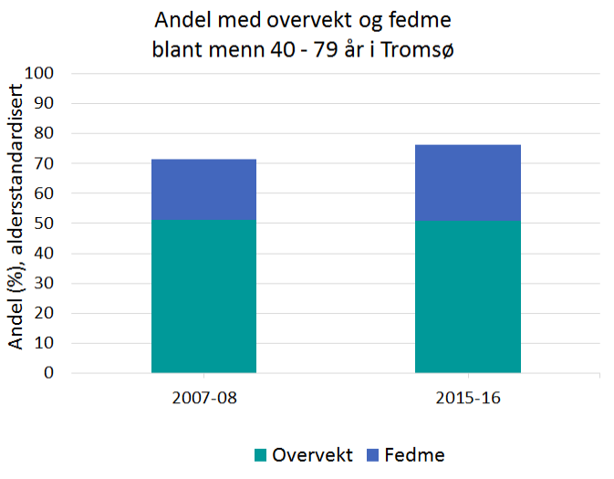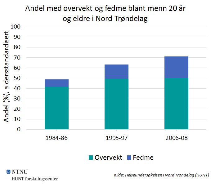 Andelen voksne som har overvekt og fedme har økt i perioden vi har målinger fra, siden midten av 1980-tallet og fram til i dag. Økningen var sterkest fram til rundt 2008, deretter har økningen bremset noe opp fram til 2016/2019 . Dette forklares ved at andelen som har fedme har økt, mens andelen som har overvekt synes å være mer eller mindre stabil. Dette viser høyde- og vektmålinger av befolkningen i Tromsø og Nord Trøndelag.