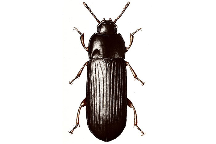 Stor melbille er en stor, brunsvart art som gjerne forekommer på steder hvor det oppbevares mel og kornprodukter. Larvene finnes vanligvis i fuktige korn- og melrester og lignende avfall som har ligget uforstyrret over lengre tid.