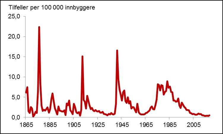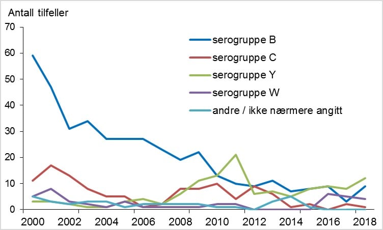 Forekomsten av invasiv meningokokksykdom har gått betydelig ned i Norge fra midten av 1980-tallet. Utover 2000-tallet har nedgangen vært særlig tydelig for serogruppe B meningokokksykdom samtidig som det er observert en liten økning av serogruppe W-sykdom (figur 2).