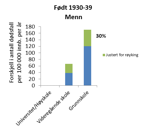 Høyden på de blå stolpene viser hva tallene hadde vært dersom de med kortere utdanning hadde røykt like lite som de med lengst utdanning. Vi ser at røyking forklarer om lag en tredjedel av de de ekstra dødsfallene (grønn farge) hos de med lavere utdanning. Resten kan forklares med forskjeller i andre levevaner og ukjente faktorer.