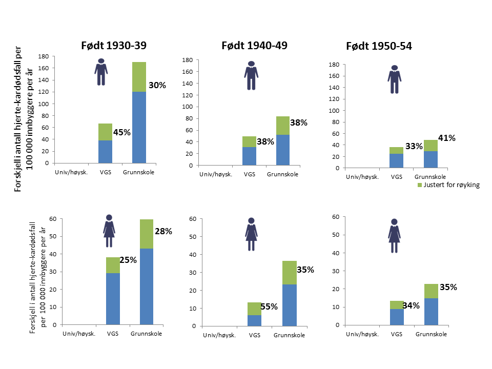 Den loddrette aksen er vist med en annen målestokk for kvinner fordi antall dødsfall er betydelig lavere enn blant menn. For kvinner som ble født på 1930-tallet var både blodtrykk, fettstoffer i blodet og røyking omtrent like viktige enkeltfaktorer for å forklare forskjellen i «for tidlig» hjerte-kardød mellom utdanningsgruppene.