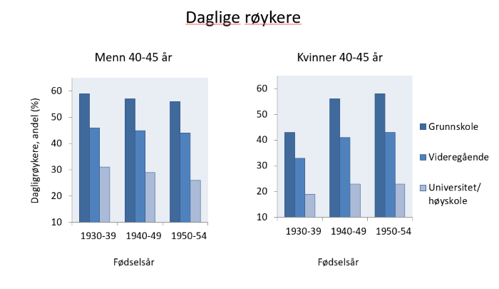 - 5 prosent av både menn og kvinner med høyskole- eller universitetsutdanning røyker daglig