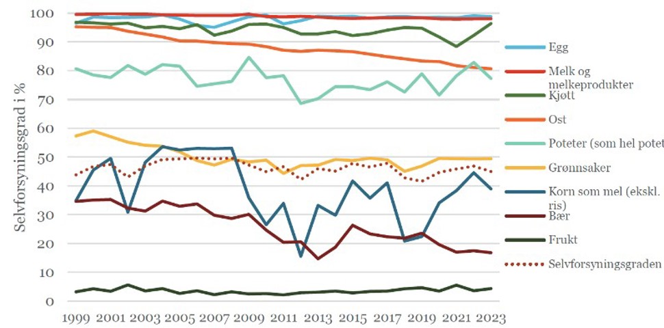 Selvforsyningsgraden ligger i dag oppunder 40 %. Det betyr at rundt 60 % av det vi spiser enten er importert eller produsert med importerte fôrråvarer til husdyr- og fiskeoppdrettsnæringen. Klima- og miljøavtrykket fra maten vi spiser kan derfor være betydelig i landene vi importerer fra. Å produsere i Norge vil redusere karbonlekkasjen til andre land.