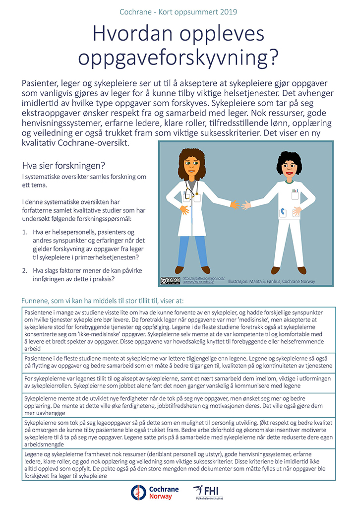 I systematiske oversikter samles forskning om ett tema. I denne systematiske oversikten har forfatterne samlet kvalitative studier som har undersøkt følgende forskningsspørsmål: Hva er helsepersonells, pasienters og andres synspunkter og erfaringer når det gjelder forskyvning av oppgaver fra leger til sykepleiere i primærhelsetjenesten? Hva slags faktorer mener de kan påvirke innføringen av dette i praksis?