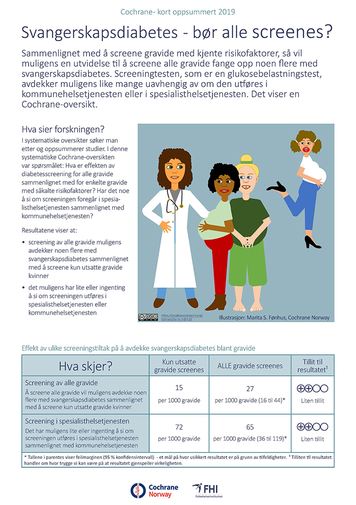 I systematiske oversikter samles og vurderes tilgjengelig forskning. I denne systematiske oversikten har forfatterne samlet forskning om effekt av diabetesscreening for alle gravide sammenlignet med for enkelte gravide med såkalte risikofaktorer. De søkte svar på om det var noen vesentlig forskjell i hvor mange gravide med svangerskapsdiabetes som fanges opp. Resultatene viser at: