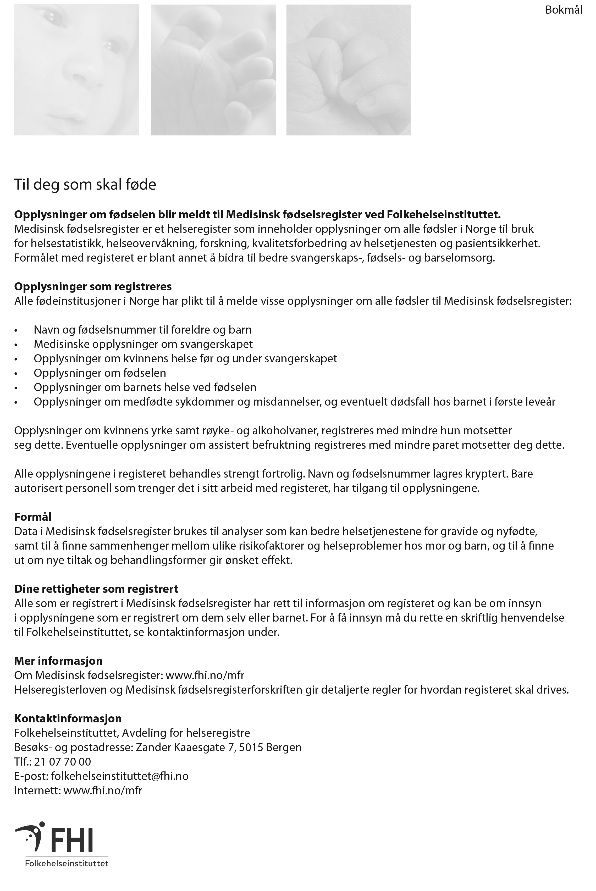 Informasjon til fødende om hva som registreres i Medisinsk fødselsregister og rettighetene til den som er registrert. Informasjonsskrivet deles ut på landets fødeavdelinger.