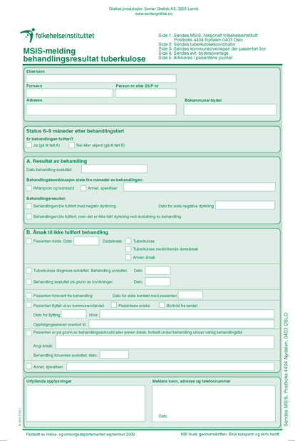 Dersom behandlingen av ulike grunner ikke avsluttes innenfor dette tidsrommet skal dette skjemaet sendes inn med angivelse av årsak til ikke fullført behandling. Nytt skjema sendes når behandlingen avsluttes. For multiresistent tuberkulose kan dette dreie seg om lenger tid. Skjemaet skal fylles og lages i fem kopier som sendes med vanlig post til de fem mottakerne som er anført øverst til venstre på skjemaet.