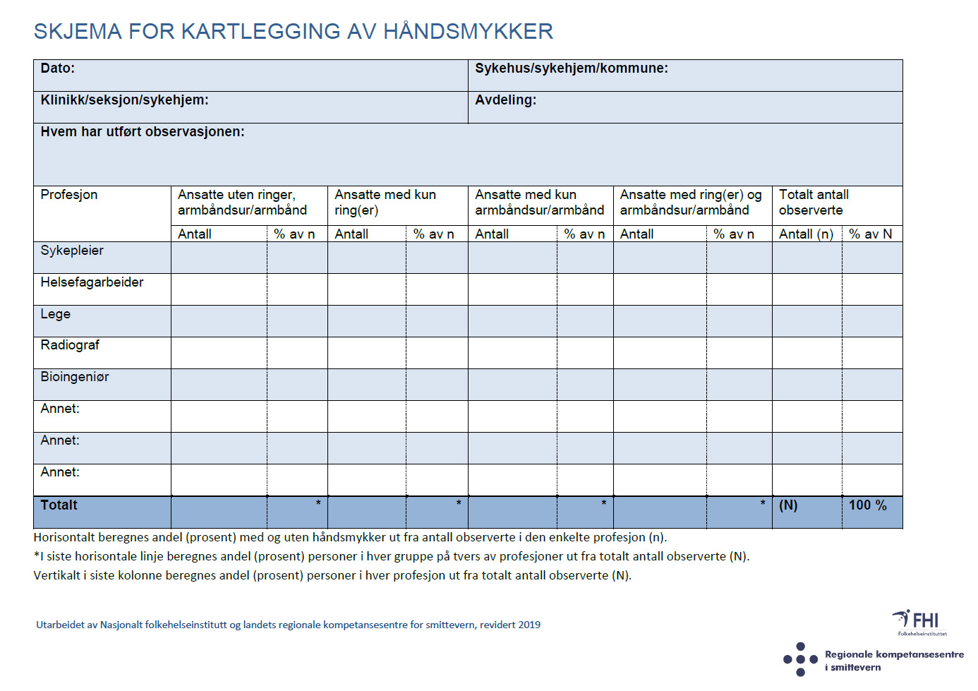 Registreringsskjema for personalets bruk av håndsmykker i sykehus og sykehjem. Oppdatert 2019.