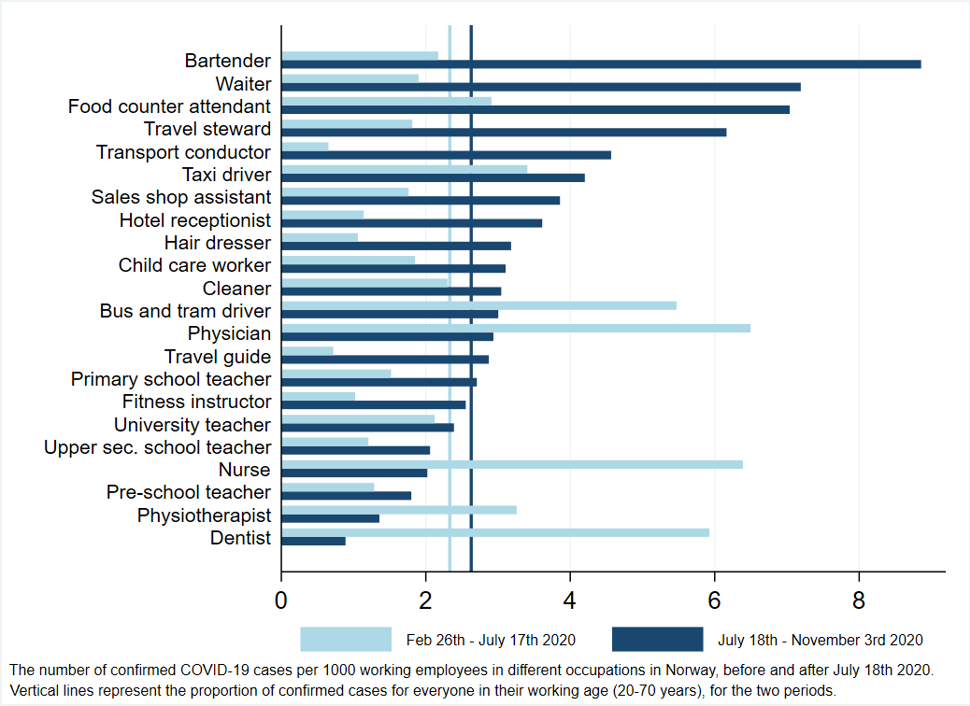 There were more registered cases of COVID-19 in some occupations than in others, according to a new study from the Norwegian Institute of Public Health. Occupations with a potentially increased risk include drivers, healthcare personnel and employees in bars and restaurants.