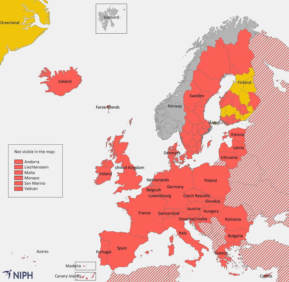 Go to the home pageBased on the weekly assessment of the transmission situation for coronavirus, the Government has decided that the region will change from yellow to red in the infection map for Europe. As a result, the travel advice will change. All travellers from this region who come to Norway from Saturday 24 October at 00.00 a.m. must go into 10 days of quarantine.