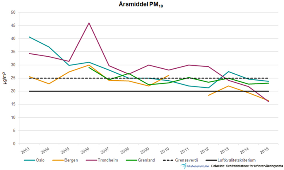 Figure 1A: Annual mean levels of particulate matter (PM10) in Oslo, Bergen, Trondheim and Grenland from 2003 to 2015. Figure also shows limit values (dotted black line) and air quality criteria (solid black line). Source: Central database for air monitoring data, Norwegian Environment Agency.