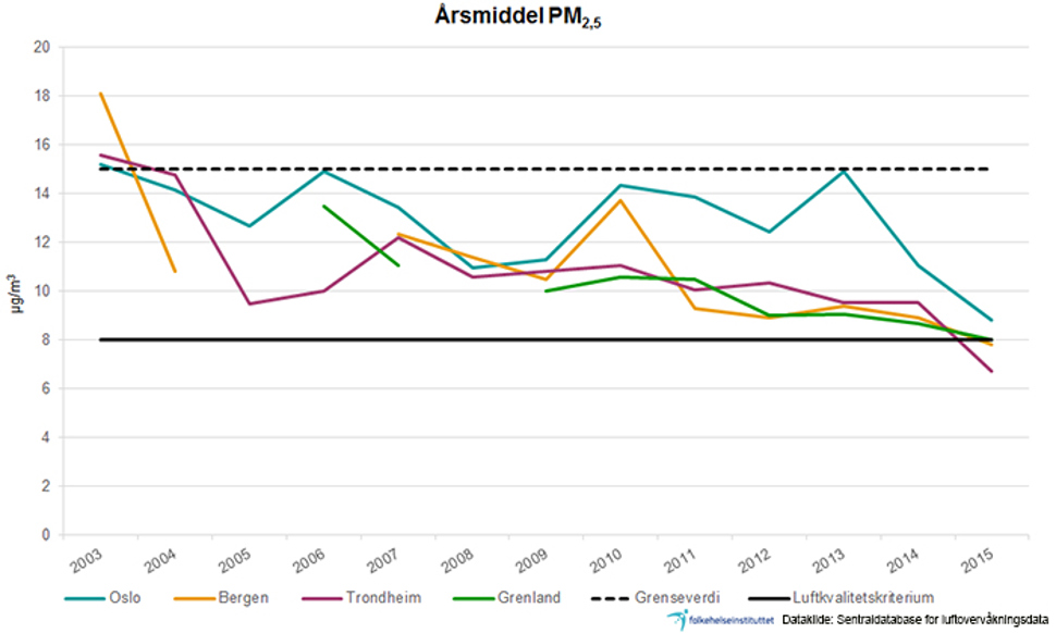 Figure 1B: Annual mean levels of particulate matter (PM2.5) in Oslo, Bergen, Trondheim and Grenland from 2003 to 2015. Figure also shows limit values (dotted black line) and air quality criteria (solid black line). Source: Central database for air monitoring data, Norwegian Environment Agency.