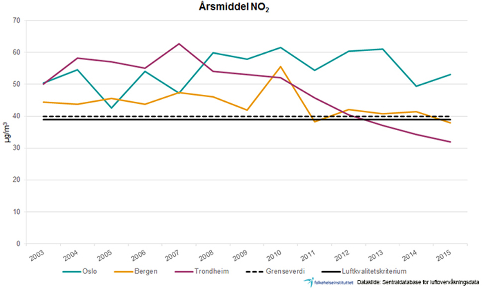 Figures 1A-B, 2A-B and 3 show the levels of particulate matter (PM2.5 and PM10), nitrogen dioxide (NO2), and ozone in recent years (2003–2015) in the most polluted towns in Norway.