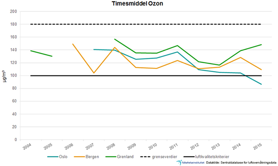 Figure 3: Maximum hourly mean concentration of ozone in Oslo, Bergen and Grenland from 2004 to 2015. The figure also shows the threshold for public information (black dotted line) and air quality criteria (black line). Source: Central database for air monitoring data, Norwegian Environment Agency.