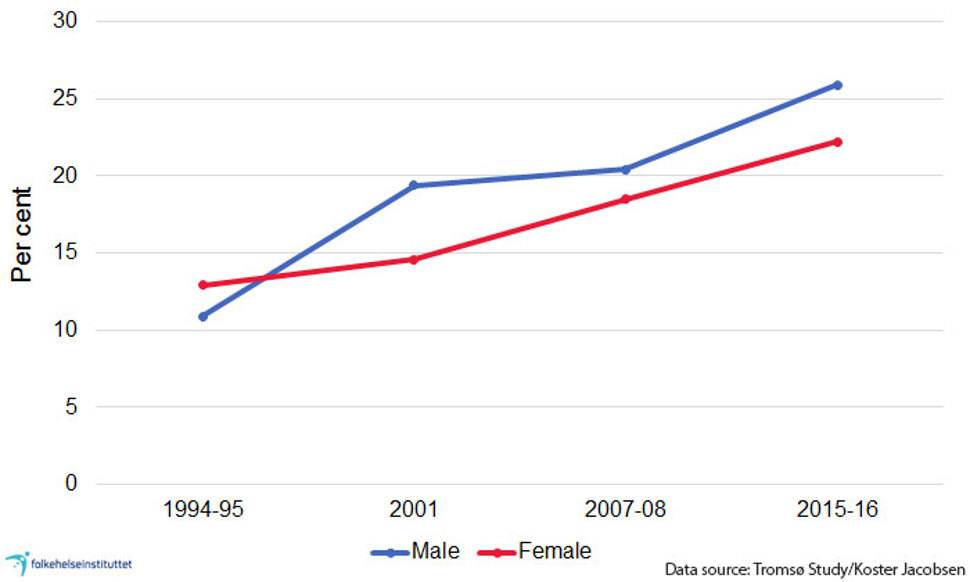The Tromsø Study and the Trøndelag Health Study (HUNT, in the former Nord-Trøndelag county) report that most adults are either overweight or obese. We do not have national figures based on measured height and weight, but these two studies from the period 2015-2016 (Løvsletten et al., 2020) and 2017-2019 (Erik R. Sund, unpublished data) show that: