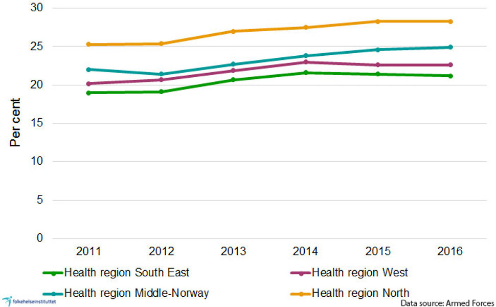 Results from the Fit Futures 2 health survey in 2012-2013 among upper secondary school students in Tromsø and Balsfjord municipality show that a total of 21 per cent of young women and 28 per cent of young men aged 18-20 were overweight or obese (Evensen et al., 2017).