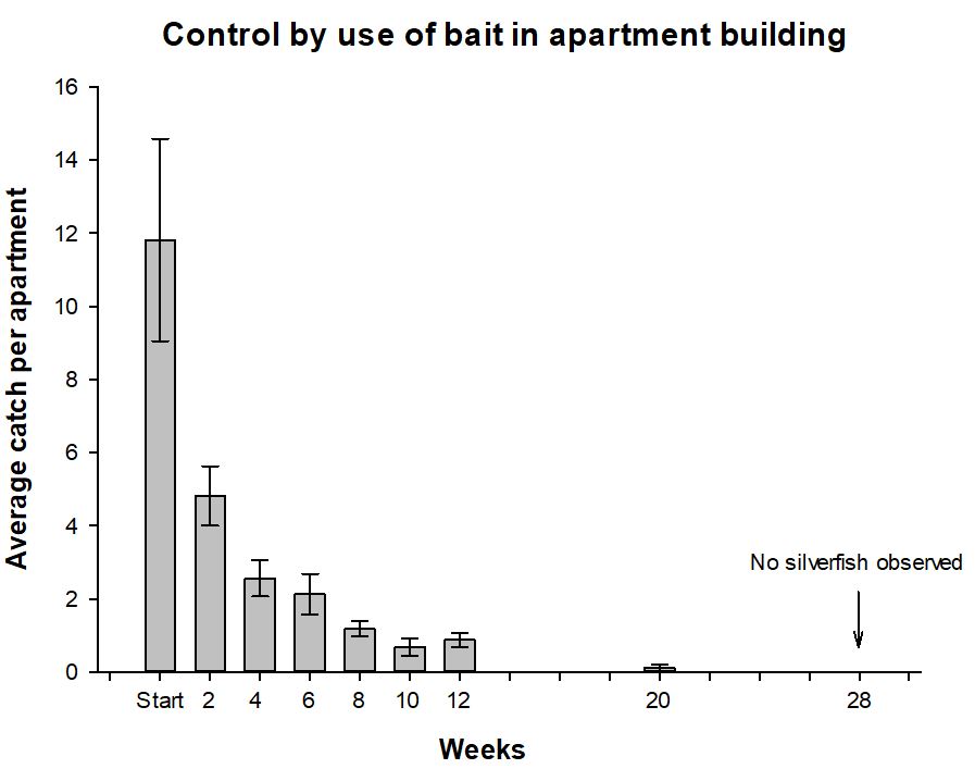 An important explanation for efficient control is probably a large degree of secondary poisoning (Figure 8). The long tailed silverfish will be consumed rapidly by conspecifics when they die from the bait. The bait-killed individuals contain a sufficient amount of toxins to also kill individuals only feeding on the dead (8).