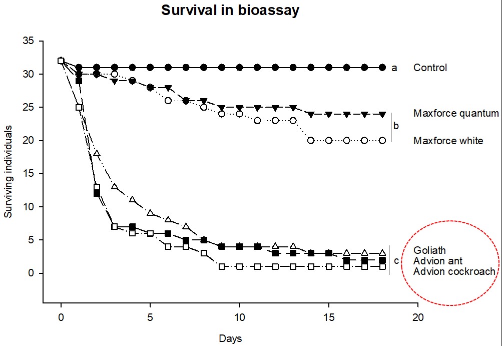 Laboratory studies show that at least four of the baits available to the pest industry have good effect, while others have only limited effect (Figure 7) so it is important to choose the right product. Bait with the active ingredient indoxacarb is particularly efficient.