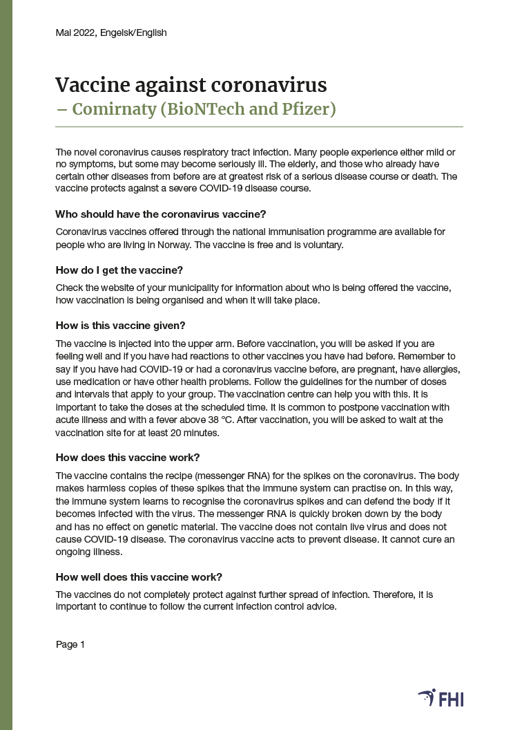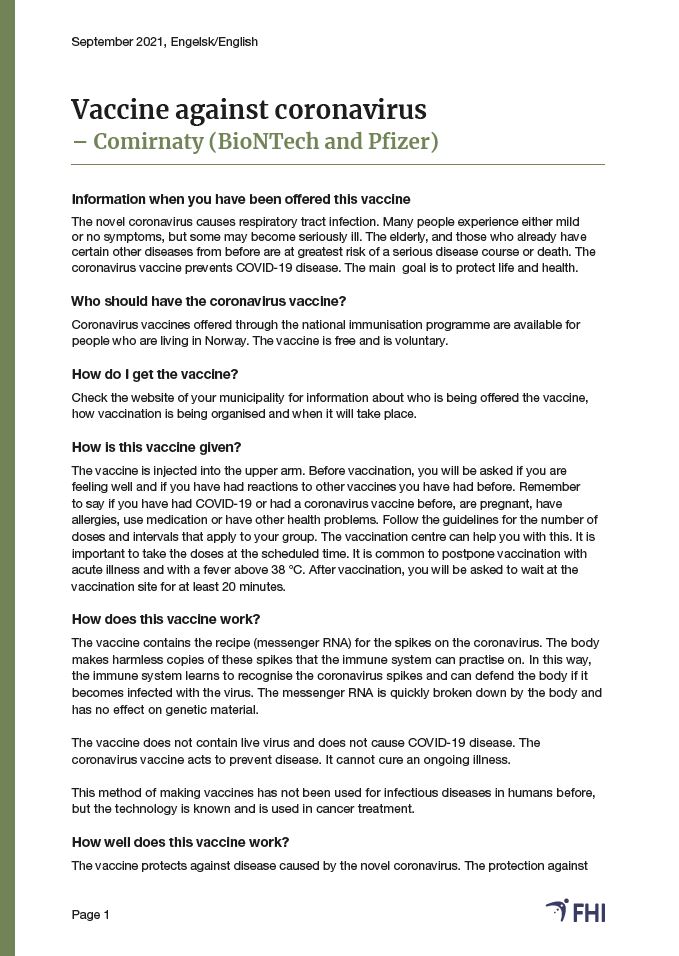 Information about the Comirnaty vaccine in many languages. It is intended for people who are offered this vaccine to help them make an informed choice.