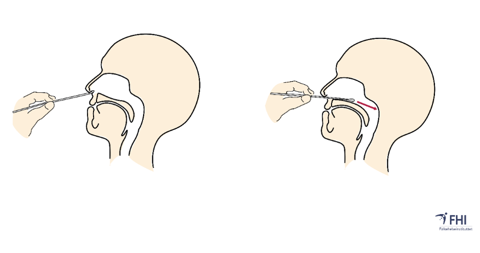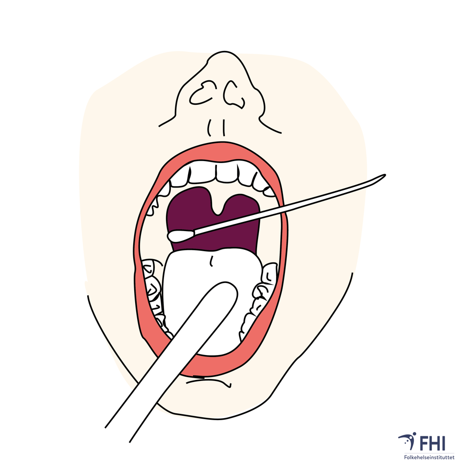 Følg bruksanvisningen til testen ved prøvetaking, men ta prøve fra svelget før den samme prøvepinnen brukes til prøvetaking fra nese (se fremgangsmåte under).
