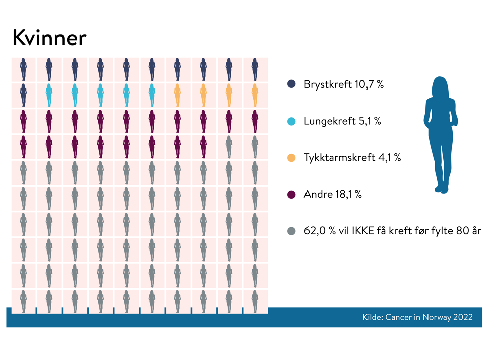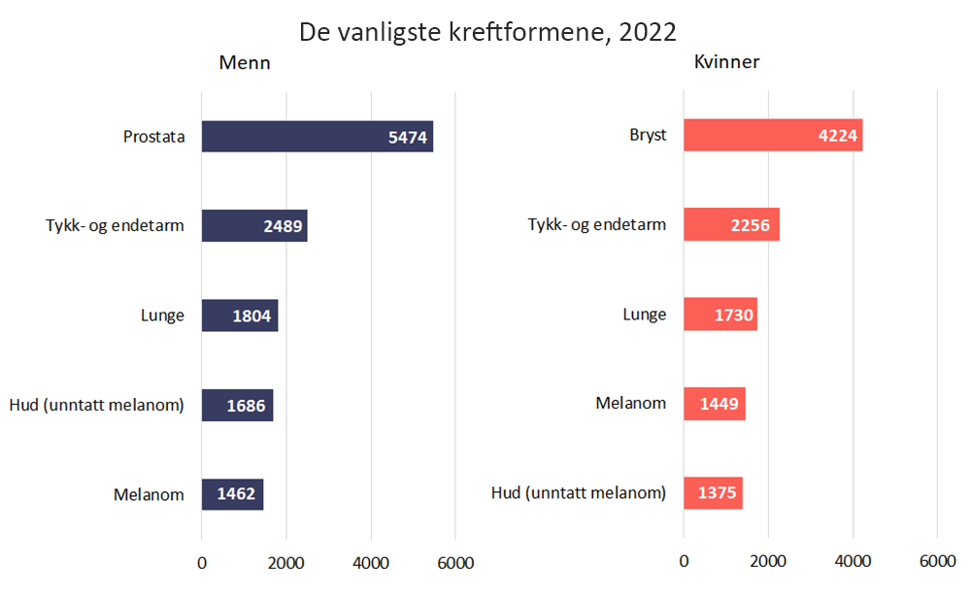 - Blant kvinner er kreft i bryst, tykktarm, lunge, hud (utenom melanom) og melanom i hud de fem vanligste kreftformene, og utgjorde om lag 6 av 10 av alle nye krefttilfeller i 2024.