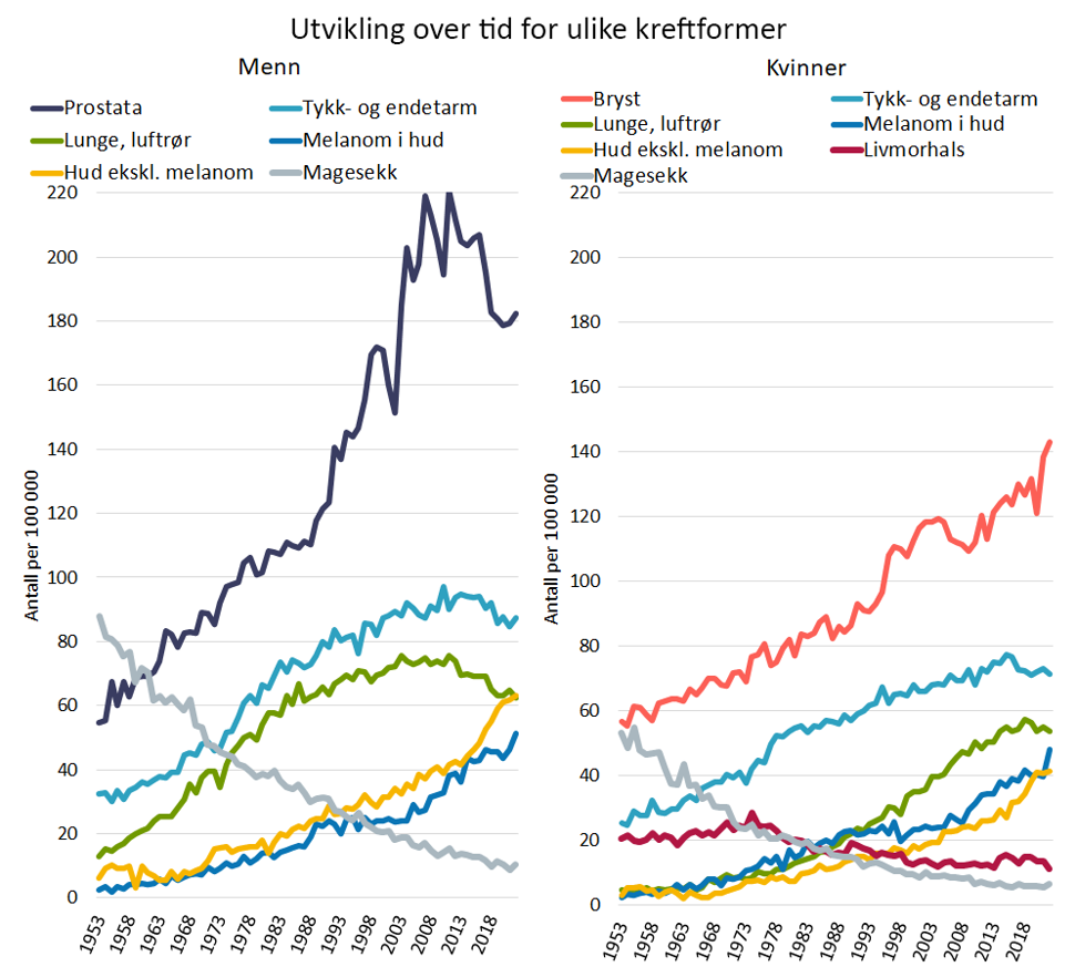 For de aller fleste kreftformene har det også vært en økning i de aldersstandardiserte ratene de siste 70 årene, som vil si at risikoen for kreft har økt. To kreftformer har imidlertid hatt en klar nedgang i forekomsten: Kreft i magesekk var blant de vanligste kreftformene da kreftregistreringen startet i Norge i 1953. Siden den gang har det vært en jevn og stabil nedgang både blant menn og kvinner, og i dag er kreft i magesekk en relativt sjelden sykdom.
