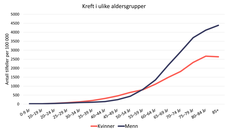 Figur 3 viser antall nye tilfeller av kreft totalt per år per 100 000 for menn og kvinner i ulike aldersgrupper (aldersspesifikk insidensrate). Median alder ved diagnose for alle kreftformer samlet er 71 år. Det betyr at halvparten av alle som diagnostiseres med kreft, er 71 år eller mer.
