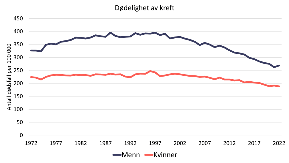 Andelen av befolkningen som dør av kreft har aldri vært så lav i nyere tid som tallene for 2024 viser. Kreft har siden 2017 vært den hyppigste dødsårsaken i befolkningen foran hjerte- og karsykdom. Lungekreft er den kreftformen som tar flest liv blant både kvinner og menn (FHI, 2025).