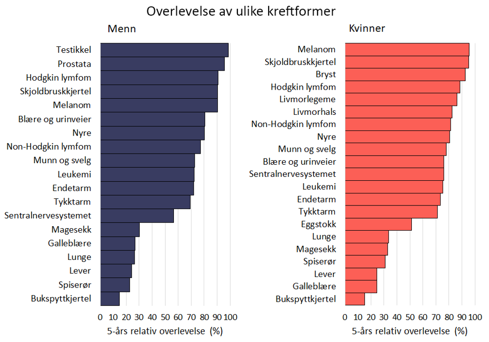 Blant menn ser vi den høyeste overlevelsen for testikkelkreft. Her overlever nesten 100 prosent sin kreftform i fem år eller mer. Også for prostatakreft er den relative overlevelsen høy (95,9 prosent). Blant kvinner ser vi høyest relativ overlevelse for melanom (95,8 prosent) og kreft i skjoldbruskkjertelen (95,7 prosent). Bukspyttkjertelkreft er den kreftformen med lavest relativ overlevelse både blant menn og kvinner.