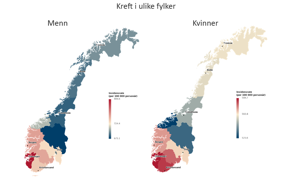 Forekomsten av kreft (målt som aldersstandardiserte insidensrater) varierer mellom fylkene. For all kreft samlet sett er det Rogaland som har den høyeste kreftforekomsten per 100 000 innbyggere blant menn, mens Vestfold har den høyeste forekomsten blant kvinner. Den laveste forekomsten av kreft ses i Finnmark, både for kvinner og menn (figur 7). For mer informasjon om kommune og fylkesinsidens henviser vi til Kreftregisterets statistikkbank.