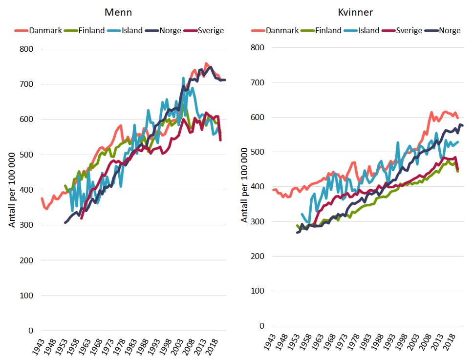 Fra å være det landet i Norden med lavest kreftforekomst på 1950-tallet, har Norge nå, sammen med Danmark, den høyeste kreftforekomsten blant menn, og den nest høyeste forekomsten blant kvinner etter Danmark (figur 8).