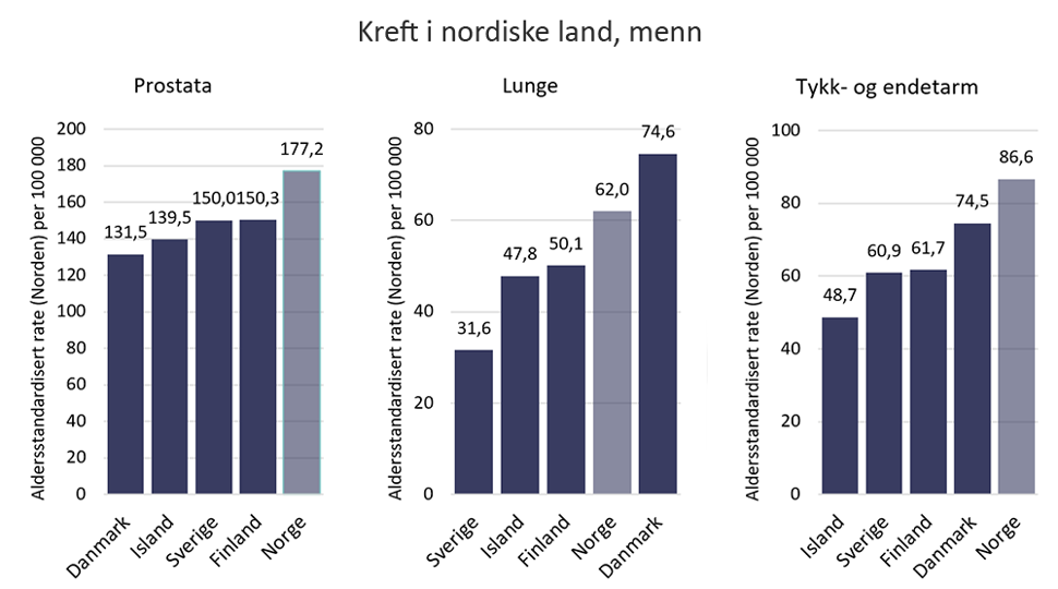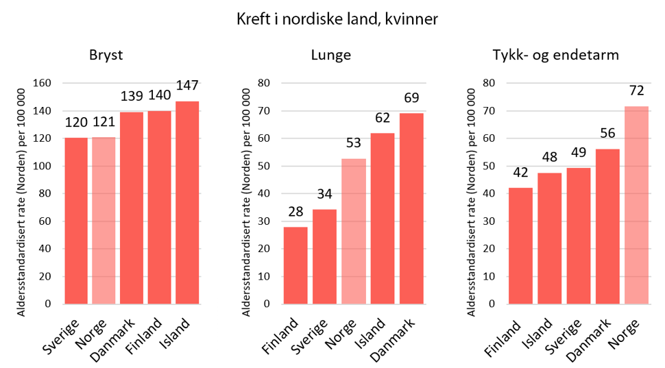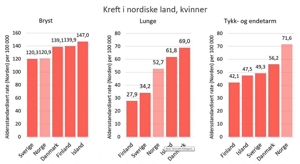 Figur 9 a og b viser forekomsten av noen av de vanligste kreftformene for kvinner og menn i Norden i 2022. Norge har den høyeste forekomsten av tykk- og endetarmskreft blant de nordiske landene, og faktisk er det estimert at norske kvinner har den høyeste risikoen også på verdensbasis. Videre ser vi at det er en relativt stor forskjell i forekomsten av lungekreft.