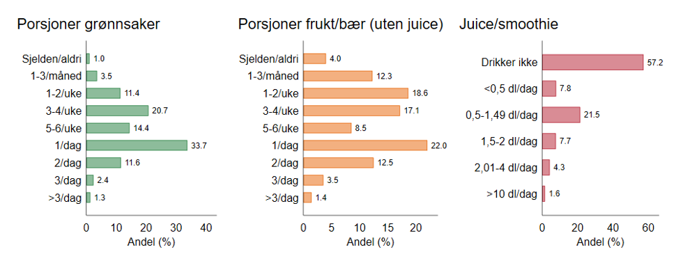 I Den nasjonale folkehelseundersøkelsen oppga deltakerne at de spiste i snitt to porsjoner grønnsaker daglig. Andelen som spiste de anbefalte fem porsjonene frukt og grønnsaker, var svært lav (Abel & Totland, 2021).