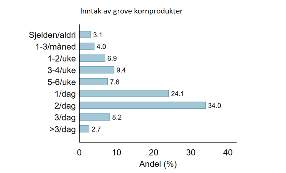 - Om lag 60 prosent spiste anbefalt mengde fullkorn. Det vil si at 40 prosent spiste mindre fullkorn enn to grove brødskiver per dag eller tilsvarende.