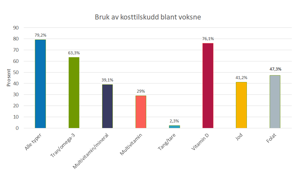 Den nasjonale folkehelseundersøkelsen 2020 viste at nesten 80 prosent av voksne (18 år og eldre) hadde tatt ett eller flere av kosttilskuddene som var listet opp i spørreskjemaet i løpet av det siste året (se figur) (Abel & Totland, 2021).