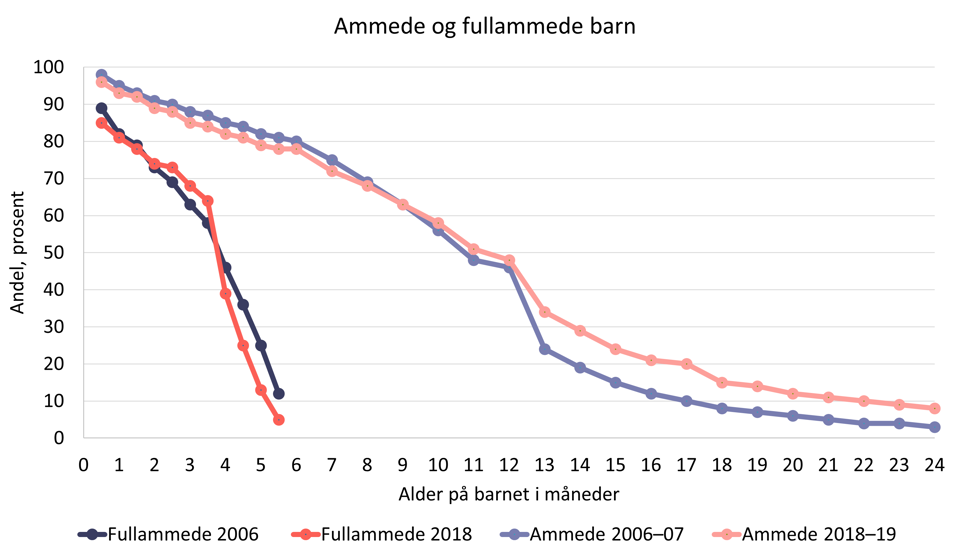 Andelen som fikk morsmelk var 93 prosent ved 4 ukers alder, 82 prosent ved 4 måneders alder og 78 prosent ved 6 måneders alder. Andelen som fikk morsmelk uten annet tillegg (fullammet) var 81 prosent ved 4 ukers alder, 39 prosent ved 4 måneders alder og 5 prosent frem til 6 måneders alder (Myhre, Andersen, & Kristiansen, 2020). Om lag halvparten av spedbarna (48 prosent) fikk morsmelk i kombinasjon med annen ernæring ved 12 måneders alder (Paulsen, Myhre, Andersen, & Kristiansen, 2020).