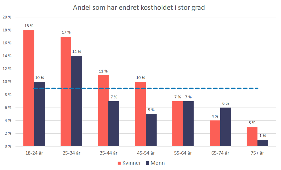 I Den nasjonale folkehelseundersøkelsen oppga 62 prosent at de hadde gjort endringer for å få et mer bærekraftig eller miljøvennlig kosthold de siste tre årene. Oftere vegetarisk middag, redusert kjøttinntak og mer lokalmat var blant tiltakene som ble rapportert. Det var betydelig større andel blant yngre som hadde gjort store endringer, og 18 prosent av kvinnene mellom 18 og 24 år svarte at de hadde gjort slike endringer i stor eller svært stor grad (Abel og Totland, 2021).
