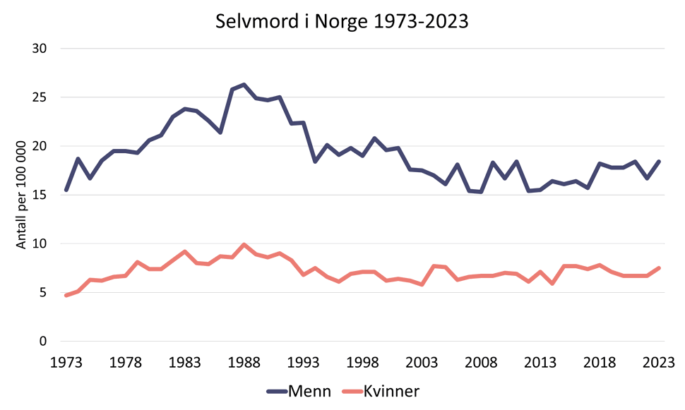 I perioden 1970 til 1990 doblet risikoen for selvmord seg, for siden å falle igjen. Økningen var mest dramatisk for unge menn i aldersgruppen 15-24 år. I 2024 var selvmordsraten 13,3 per 100 000 innbyggere, som er om lag 19 prosent lavere enn i 1990, da raten var på 16,4 per 100 000 innbyggere (FHI, 2024). Det har vært en svak, men signifikant økning i aldersstandardisert selvmordsrate mellom 2010 og 2019 (Raknes & Sveen, 2022). Raten for 2024 er den høyeste dødelighetsraten siden 1999.