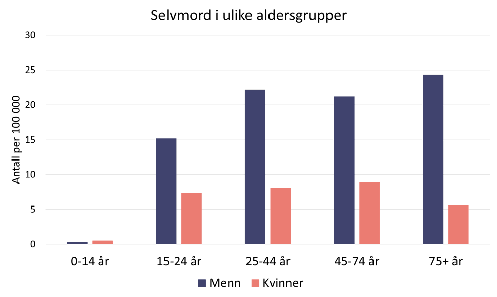 - I aldersgruppene 25-74 år er det om lag 22 selvmord blant menn per 100 000 per år, mens raten for kvinner ligger på om lag 9 per 100 000.