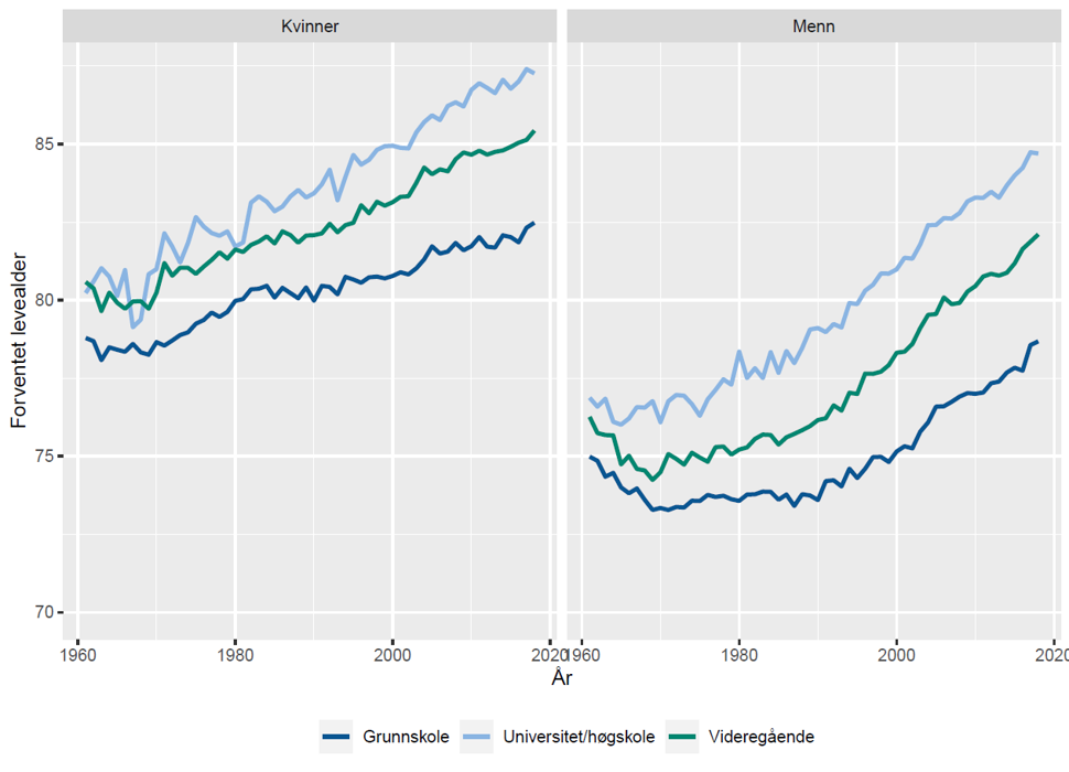 Analyser av data fra 1960 til 2009 viser at det var en nedgang i forventet gjenstående levetid blant menn i gruppene med kortest utdanning i tiåret fra 1960 til 1970 (Steingrimsdottir, 2012). Fra 1970-tallet til 2000 økte levealderen i alle gruppene blant både kvinner og menn, men mest blant dem med lengst utdanning.