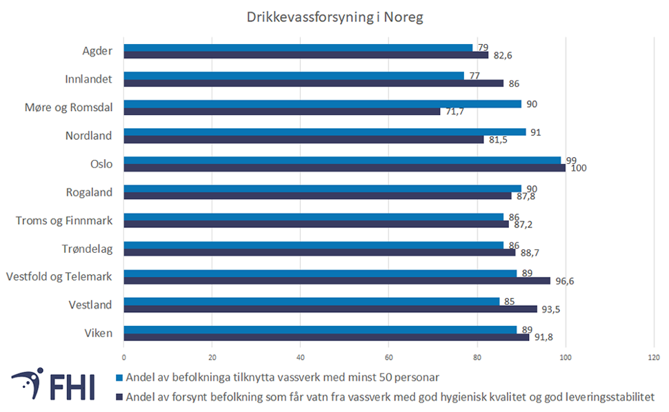 88 prosent av landets innbyggjarar er tilknytta eit vassforsyningssystem som forsyner meir enn 50 fastbuande (FHI, 2021b). Dei resterande får drikkevatn frå vassforsyningssystem der det er lite informasjon om vasskvaliteten, til dømes privateigde brønnar og små vassforsyningssystem.