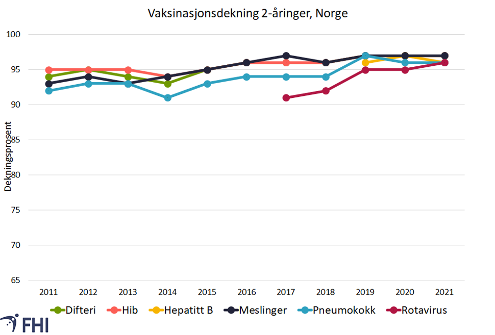 Tall fra Nasjonalt vaksinasjonsregister SYSVAK viser at det er en høy og stabil oppslutning om vaksinene i barnevaksinasjonsprogrammet i Norge. Programmet viste seg også å være robust under koronapandemien. I motsetning til mange andre land, hadde Norge i 2020 og 2021 en like høy vaksinasjonsdekning som tidligere år.