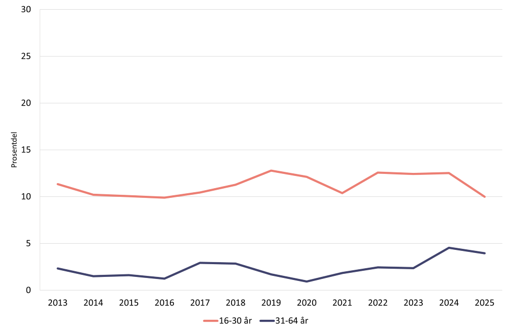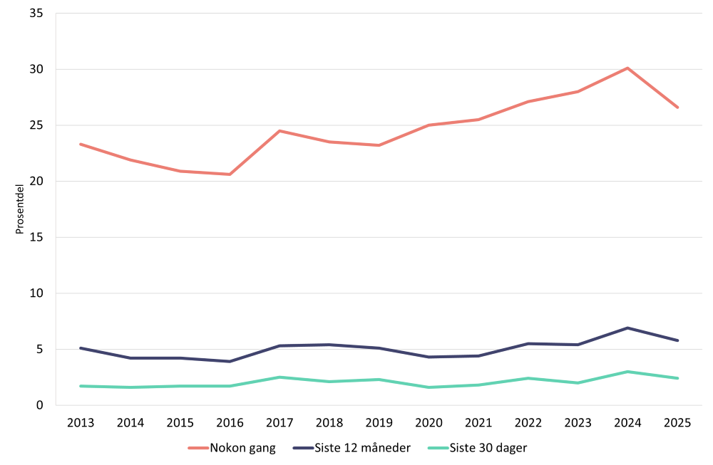 På den andre sida er det langt færre som oppgir bruk siste 12 månader og siste 30 dagar. I 2025 oppgav 6 prosent bruk av cannabis siste 12 månader og 2 prosent bruk siste 30 dagar (figur 1, sjå Helsedirektoratet, 2026 for meir detaljar).
